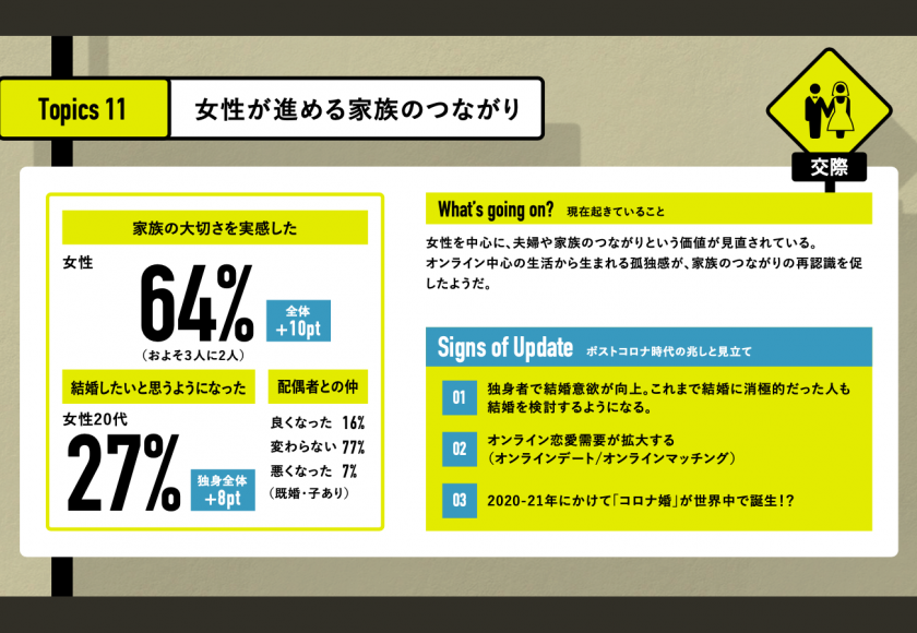 また、オンライン中心の生活の中で孤独感を感じることが増え、家族との繋がり、必要性を感じる人が増加したということです。今まで結婚に対しては消極的だった独身者も、今後の人生に「結婚」や「家族」という選択肢を組み込んでいくことになりそうです。